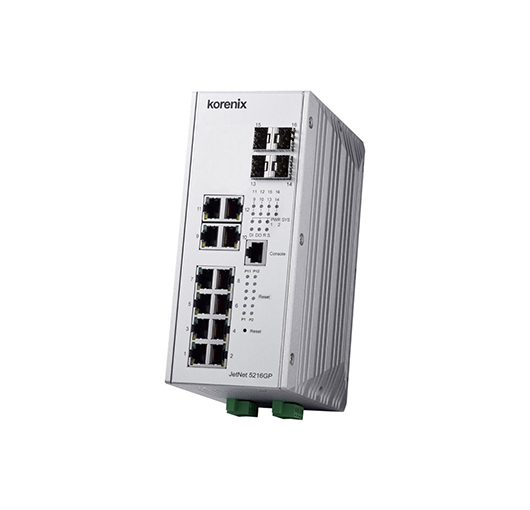 Korenix JetNet 5216GP Series, the DIN-Rail type industrial Gigabit Managed PoE Switch. JetNet 5216GP is the first industrial ethernet switch compliance with IEEE 802.3 af/at/bt, each ethernet port can max supports 90W for PD, and total budget up to 480W *Note.
